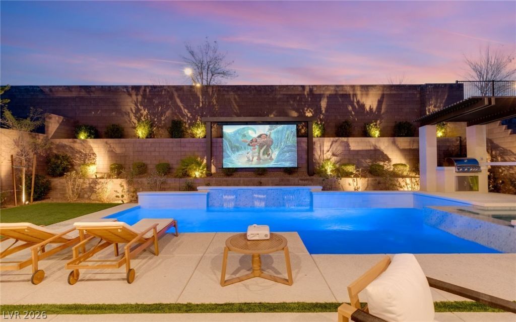 **PAID OFF SOLAR - Installed in 2022!** Experience luxury and craftsmanship in the gated community of Carmel Cliff in Summerlin. Situated on a corner lot with no rear neighbor, this open-concept plan offers a massive Next-Gen suite on the main level, private office, formal dining, chef's kitchen with a 48 stove, double-stacked cabinets, executive island w/quartz countertops, 48 built-in refrigerator and deco backsplash. Great room offers a custom vertical slat wall, ceiling speakers and stacked sliding doors for alfresco living. Contemporary railings lead to a spacious loft with an oversized balcony showcasing mountain views. Secondary bedrooms include their own bathrooms and walk-in closets, while the luxurious primary suite features private balcony access, sitting area, spa-inspired bath w/freestanding tub and walk-in shower. Outside, the resort-style backyard offers a custom pool and spa, built-in barbecue, outdoor entertainment screen & professionally designed landscaping.