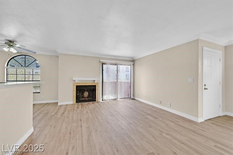 Freshly renovated 2-bedroom, 2-bath condo located in a gated community just minutes from the Las Vegas Strip. This bright second-floor unit features new luxury vinyl plank flooring, fresh interior paint, crown molding, and a cozy fireplace that creates a warm and inviting living space. The updated kitchen includes brand-new appliances and ample cabinetry, perfect for everyday living or entertaining. The spacious primary suite offers a private bathroom with a skylight that brings in beautiful natural light. Enjoy an open living and dining area, private balcony, and assigned covered parking. Community amenities include gated entry, clubhouse, and guest parking. Conveniently located near the Strip, shopping, dining, and major freeways, this move-in-ready home is ideal for both homeowners and investors.