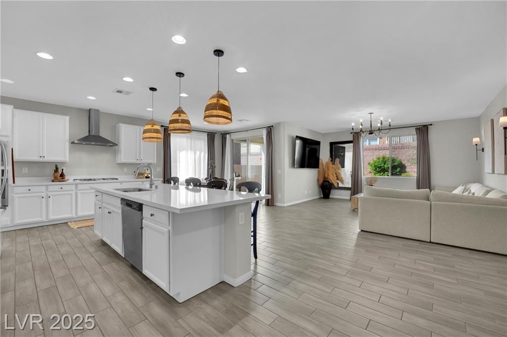 Single-story home built in 2023 inside a gated North Las Vegas community with neighborhood park and playground. This 3 bedroom, 2 bath layout offers an open concept design where the kitchen, dining, and living areas connect for everyday living and entertaining. The kitchen features quartz countertops, island seating, and pantry storage overlooking the great room. The primary bedroom is privately positioned with walk-in closet and en-suite bath, while two secondary bedrooms sit separately near the front of the home for flexible guest or office space. Covered patio and low-maintenance backyard provide outdoor living without heavy upkeep. Two-car attached garage and energy-efficient windows add convenience. Located near shopping, dining, and freeway access for commuting. Move-in ready single-level living combining newer construction, functional layout, and community amenities in North Las Vegas.