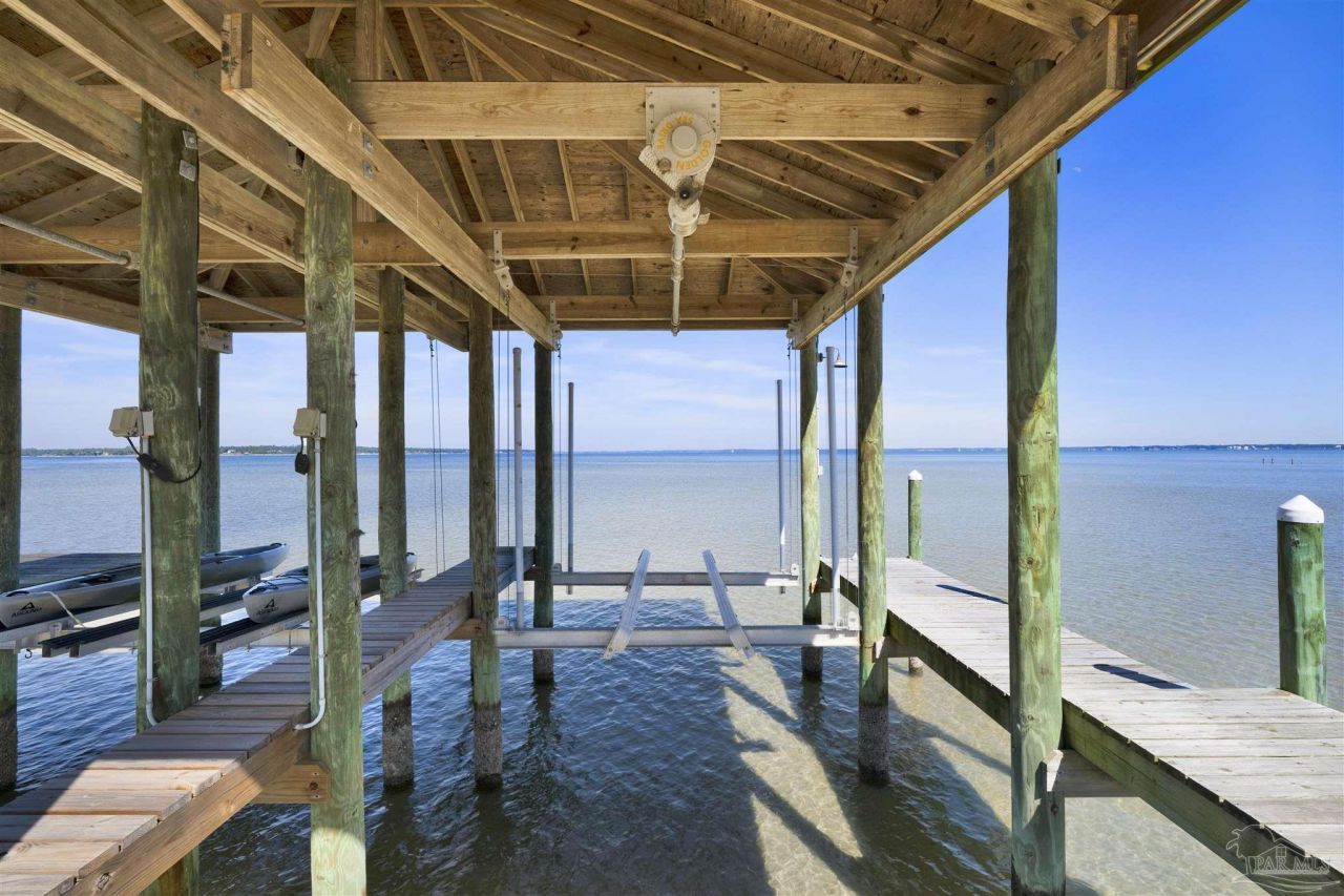 EXPERIENCE UNPARALLELED COASTAL LUXURY IN THIS METICULOUSLY RENOVATED ALL-BRICK WATERFRONT HOME IN THE GATED COMMUNITY OF INNERARITY ISLAND. POSITIONED ON A GENEROUS HALF-ACRE, THIS WATERFRONT HOME HAS 100' OF PRIVATE WATER FRONTAGE ON PERDIDO BAY, COMPLETE WITH BOATHOUSE AND TWO LIFTS! There have not been any NFIP Flood claims on this property due to the specially designed foundation that was engineered 8' above sea level! The interior of this residence underwent a stunning transformation in 2023, featuring brand-new LVT flooring throughout and a high-tech infrastructure including a Nest thermostat and Wi-Fi garage doors. The chef's kitchen is a showpiece of modern design, boasting a custom-made hood vent, commercial series gas stove with pot filler, quartz counter tops, farmhouse sink, oversized eat-in island and soft-close cabinetry. Entertaining is effortless with the addition of a custom bar featuring a built-in ice maker and beverage fridge complete with custom cabinetry. The primary suite offers a newly designed custom-built closet and a spa-like bath with double vanities, quartz counter tops, freestanding soaking tub and oversized separate shower. Outside, the upgrades continue with a full-property irrigation system, new sod, fresh exterior paint, and professional landscape lighting. Follow the new gravel path down to your private waterfront sanctuary, leading to the private pier and a newly created backyard beach area, or enjoy the bayside views from the spacious screened lanai. Located in the secure, gated community of Innerarity Island, residents enjoy exclusive access to a community park, picnic areas, and a private pier for fishing and dolphin watching - all minutes from NAS Pensacola and the beautiful beaches of Perdido Key!
