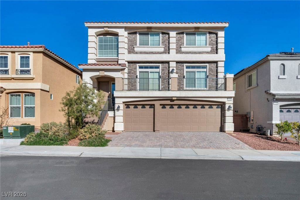 Designed for entertaining and comfortable living, this impressive tri-level home features 5 bedrooms, 3.5 bathrooms, and a 3-car garage. Dual primary suites offer privacy and flexibility for guests or multi-generational living. The open-concept kitchen includes upgraded cabinetry, a large island, stainless steel appliances, and abundant natural light. Each level is thoughtfully designed for a distinct purpose, enhancing privacy and functionality. Highlights include a spacious second-floor balcony, large walk-in showers and closets, a generous laundry room, low-maintenance backyard, and extended paver driveway. Enjoy nearby Southern Highlands parks, hiking trails, community events, entertainment, and highly rated schools?without a master-planned community fee. Conveniently located just 15 minutes from the Las Vegas Strip with easy access to highways and shopping. Has Las Vegas Strip Views.
