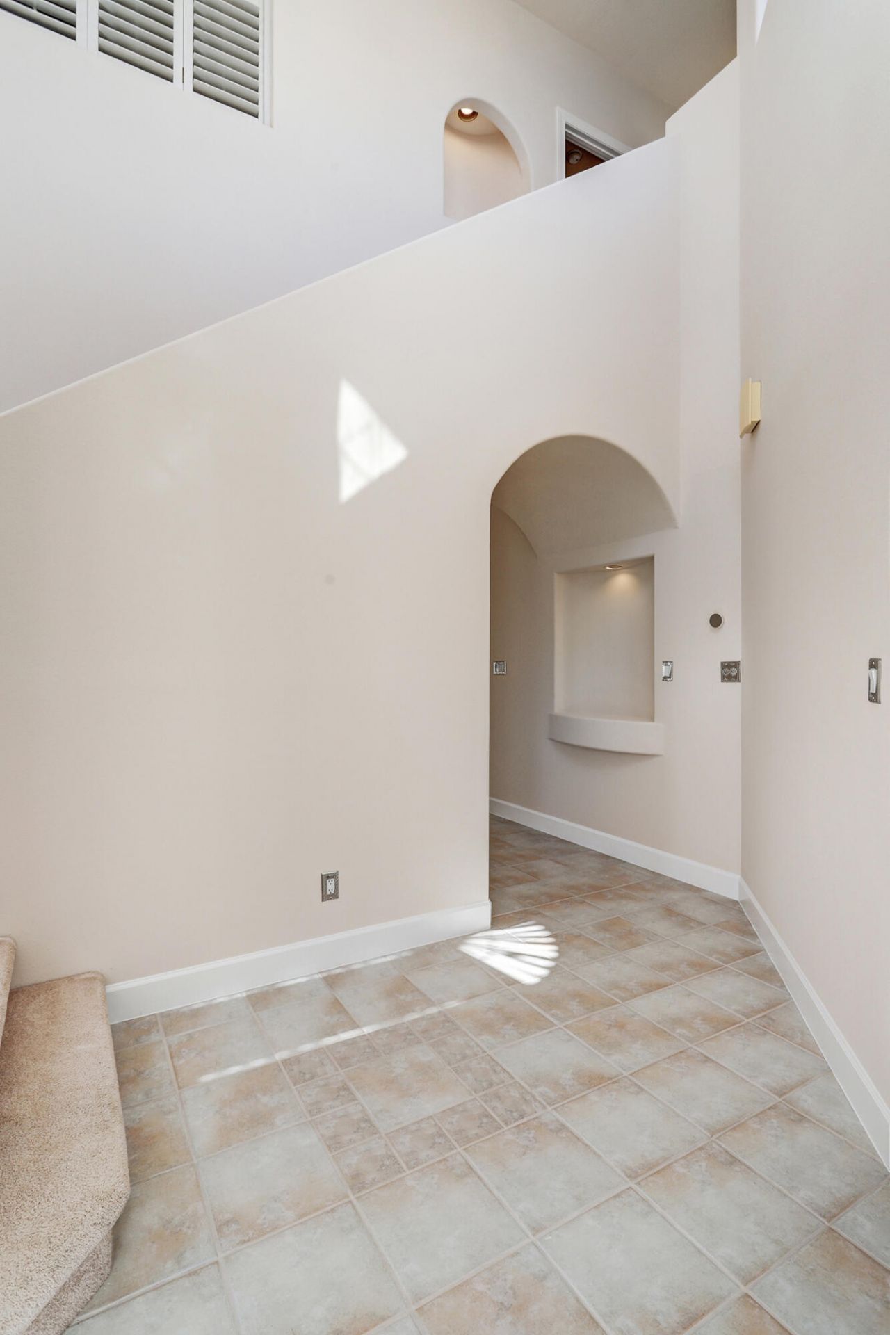 Beautifully maintained townhome in the gated Tanoan community with security, offering an open layout with gorgeous natural light, soaring ceilings, & custom shutters throughout. The main level features a spacious primary suite with private ensuite bath, double sinks, & large walk-in closet, plus an additional bedroom. The kitchen shines with its granite countertops, tile backsplash, abundant storage, & an eat-in bar, all opening to the inviting living area with a gas fireplace & dining space. Upstairs, you'll find a second oversized primary suite with jetted tub, walk-in shower, large closet, & private balcony plus a deck with stunning mountain views. The backyard is a true retreat with built-in fireplace, grill, flagstone & low-maintenance landscaping, perfect for relaxing or entertaining