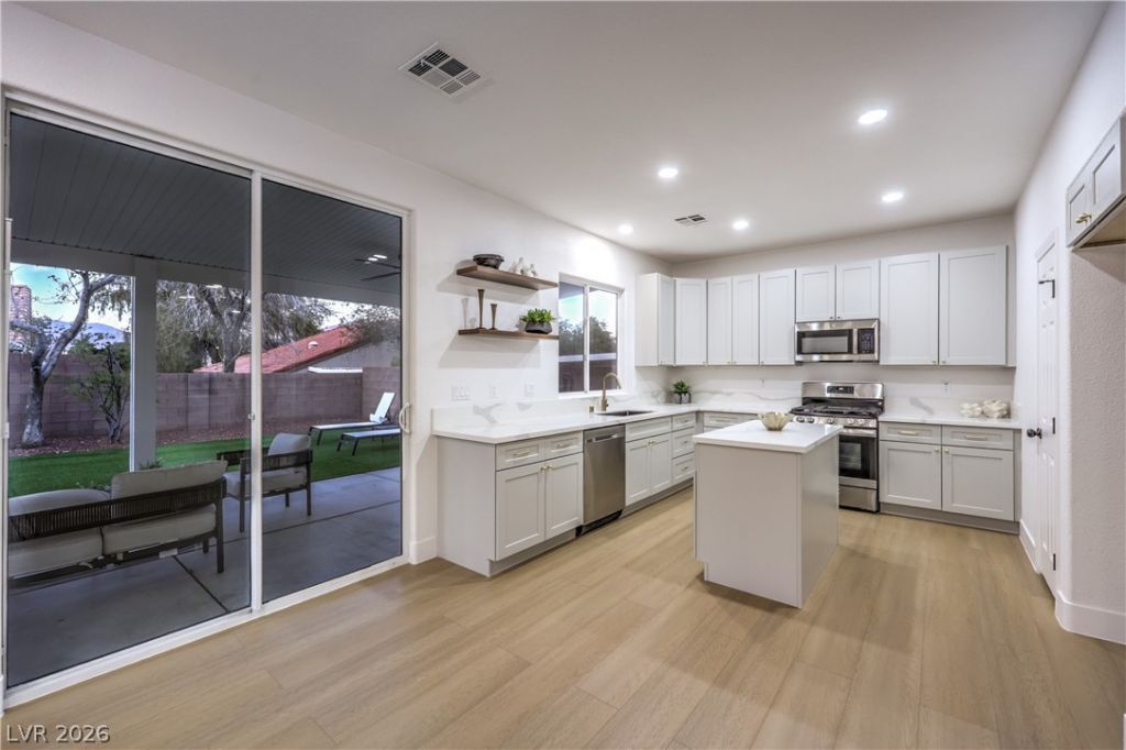 Welcome home to this move-in ready, newly remodeled two-story home featuring 4 bedrooms, a 3-car garage, and a spacious backyard with an attached covered patio. Located in the gated community of Santa Bella with quick access to Interstate 11. Inside includes natural lighting, an open floor plan, modern light fixtures, laminate wood flooring, and plush carpet throughout. The upgraded kitchen offers a garden view, pantry, recessed lighting, custom countertops, a center island with seating, cabinetry with gold hardware, floating shelves, and stainless steel appliances. Contemporary, spa-inspired bathrooms showcase new vanities with framed oval mirrors, custom lighting, a separate soaking tub in the primary suite, and modern tiled showers with built-in niches and rainfall shower heads.